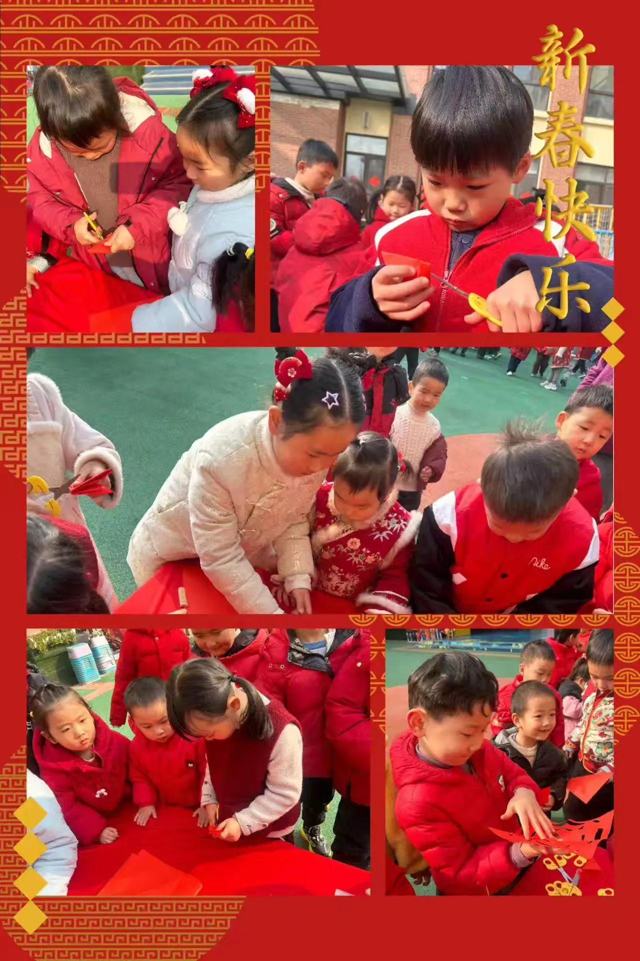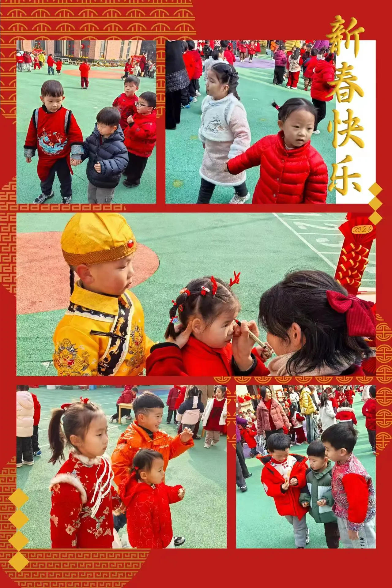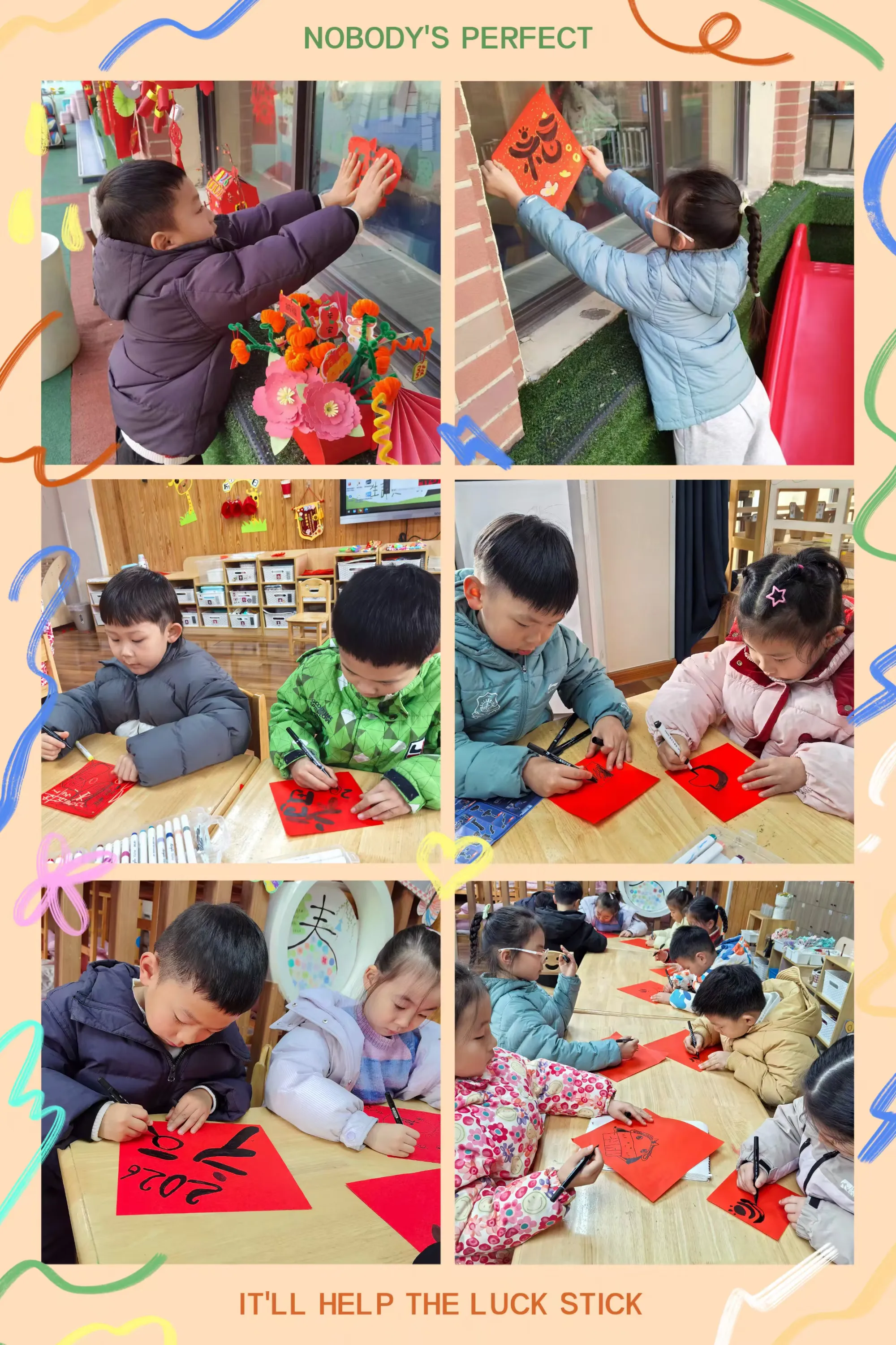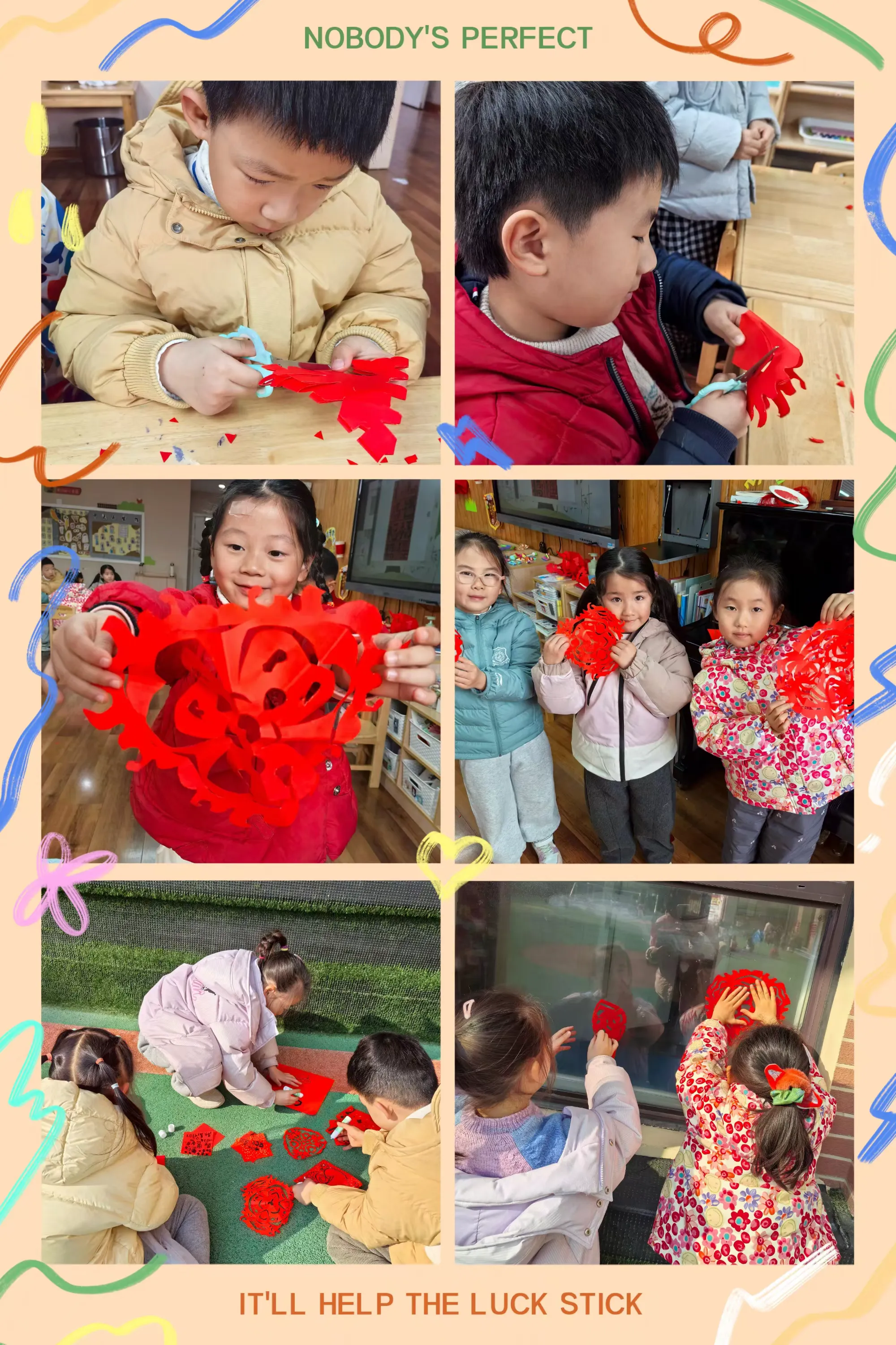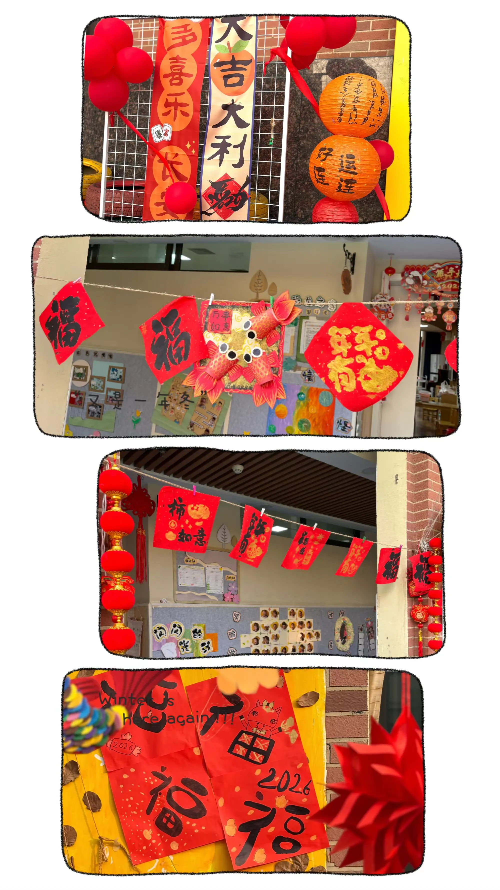 剪好的窗花、写满祝福的红色斗方,被孩子们亲手贴在教室、走廊的玻璃上。一时间,窗上红花映着笑脸,门上“福”字满载童真,灯笼高挂,彩带飘扬,孩子们用自己的双手,将整个园区装点得喜庆洋洋、年味十足。这份由童心参与营造的节日氛围,为即将开始的文化盛宴铺就了最温暖的底色。