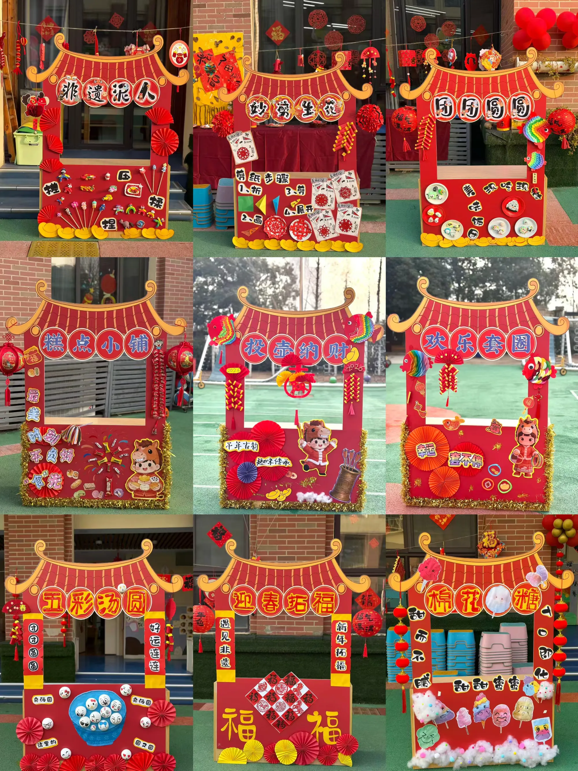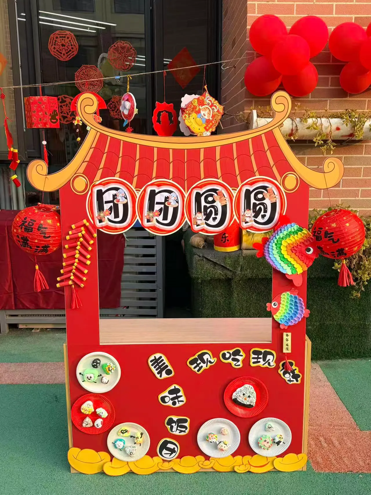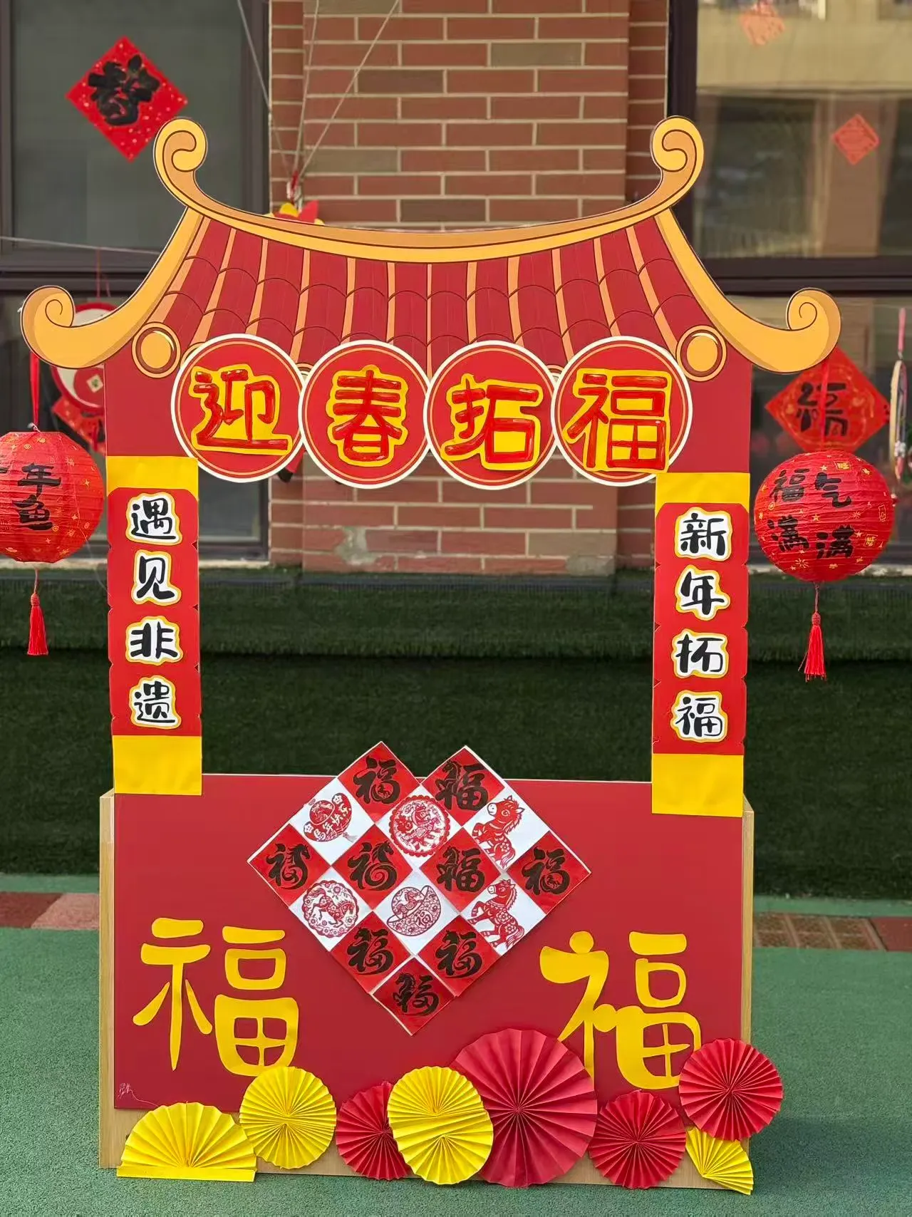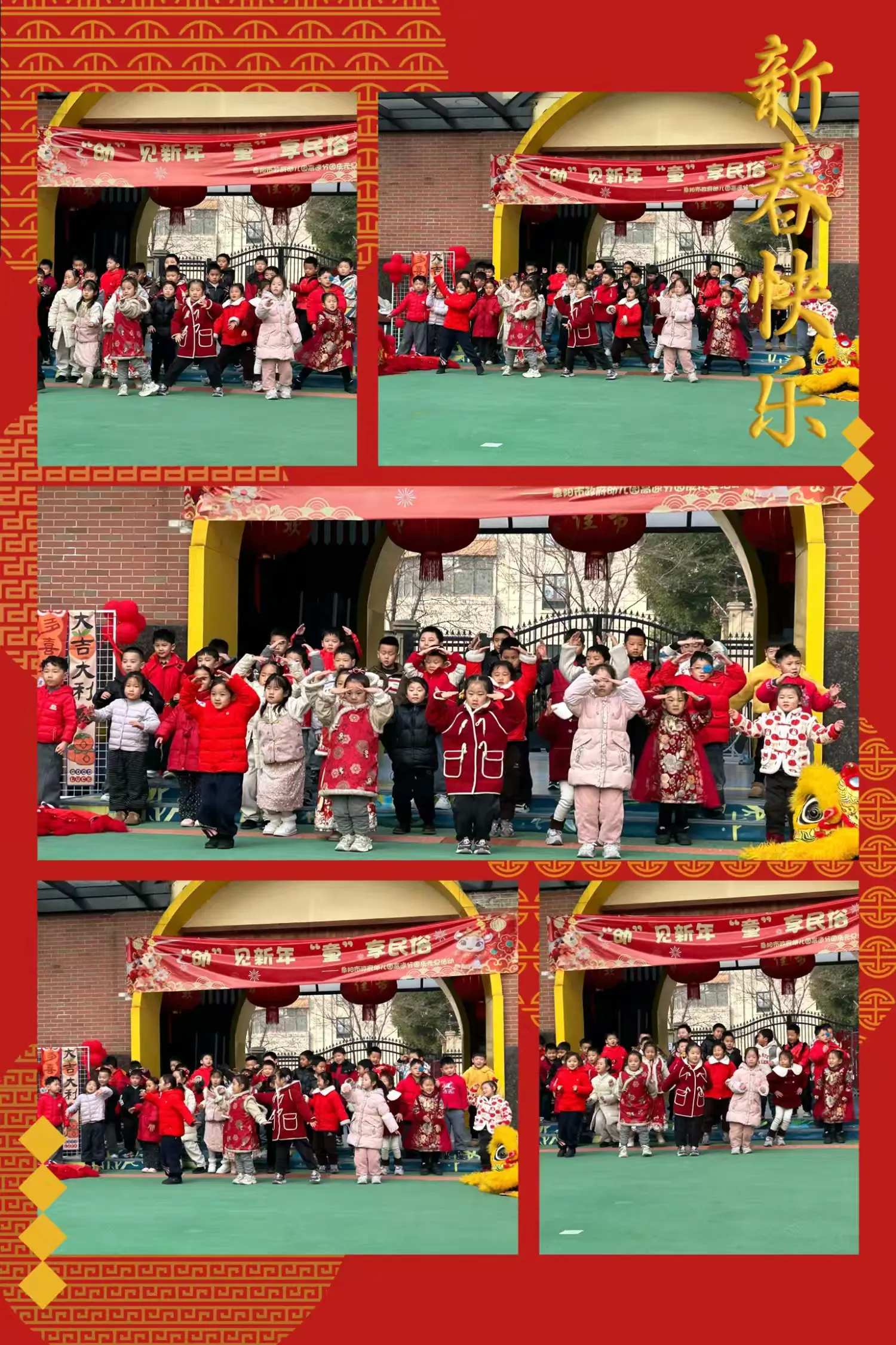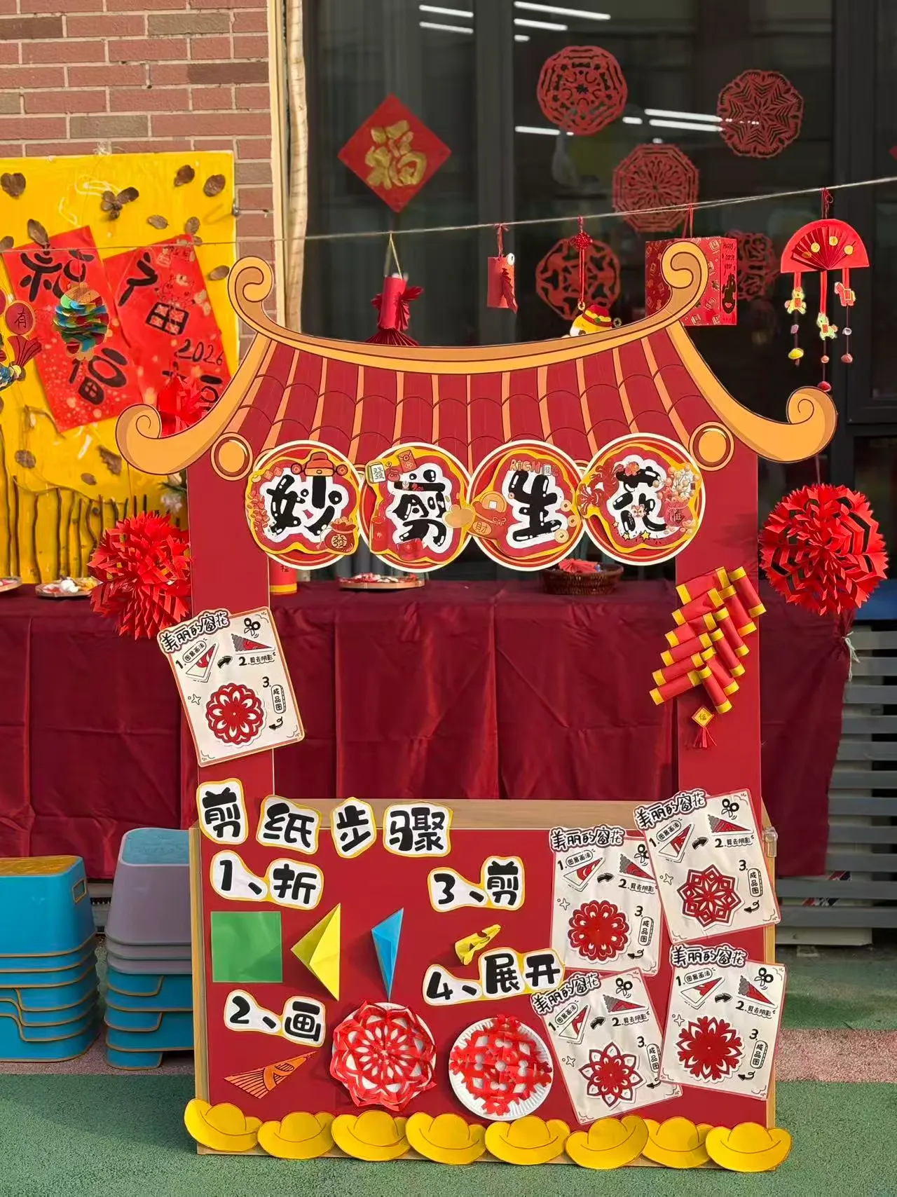 剪好的窗花、写满祝福的红色斗方,被孩子们亲手贴在教室、走廊的玻璃上。一时间,窗上红花映着笑脸,门上“福”字满载童真,灯笼高挂,彩带飘扬,孩子们用自己的双手,将整个园区装点得喜庆洋洋、年味十足。这份由童心参与营造的节日氛围,为即将开始的文化盛宴铺就了最温暖的底色。