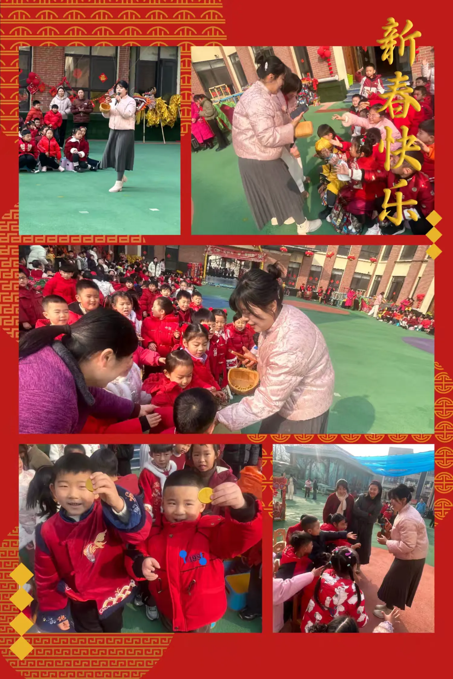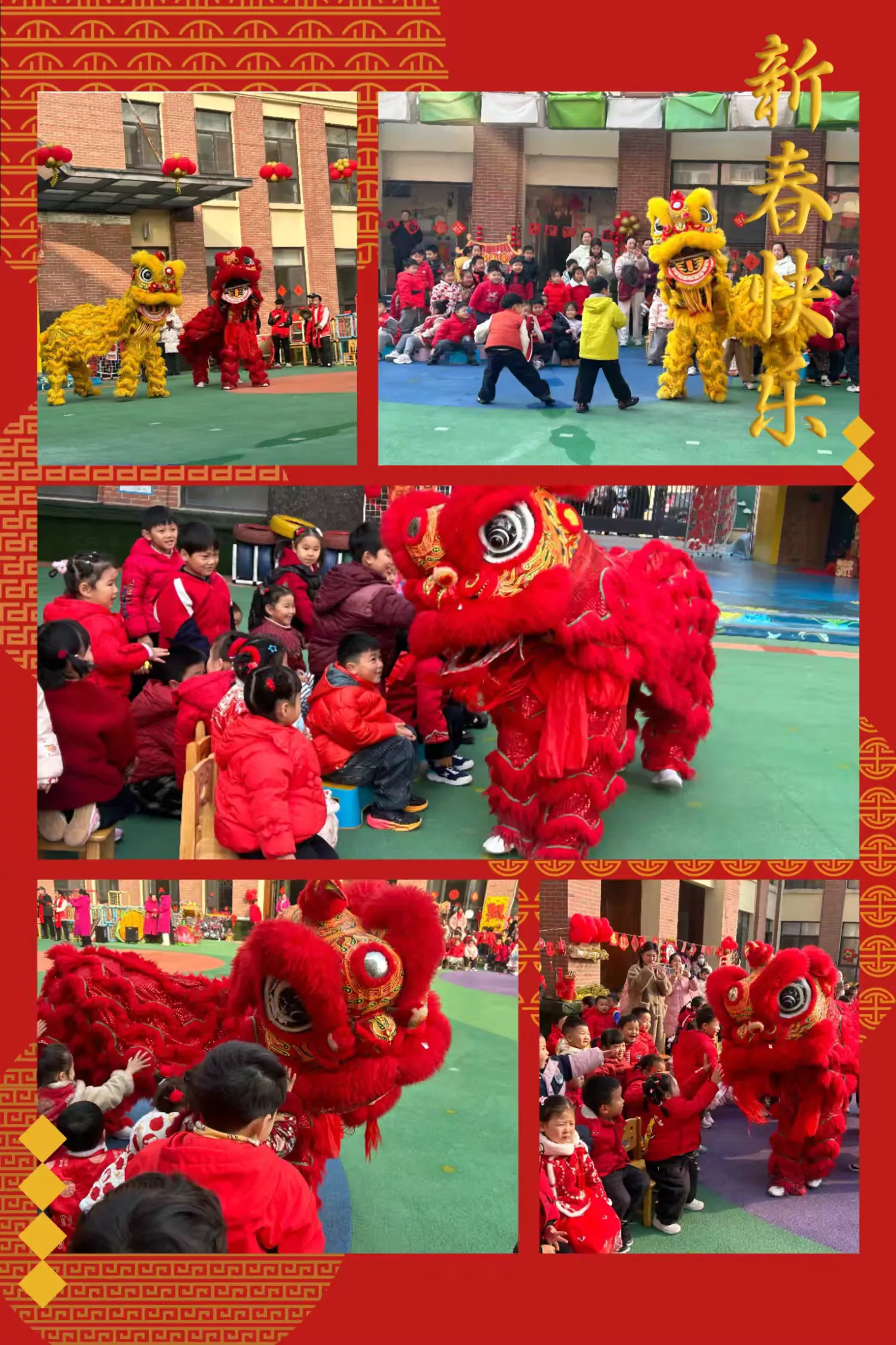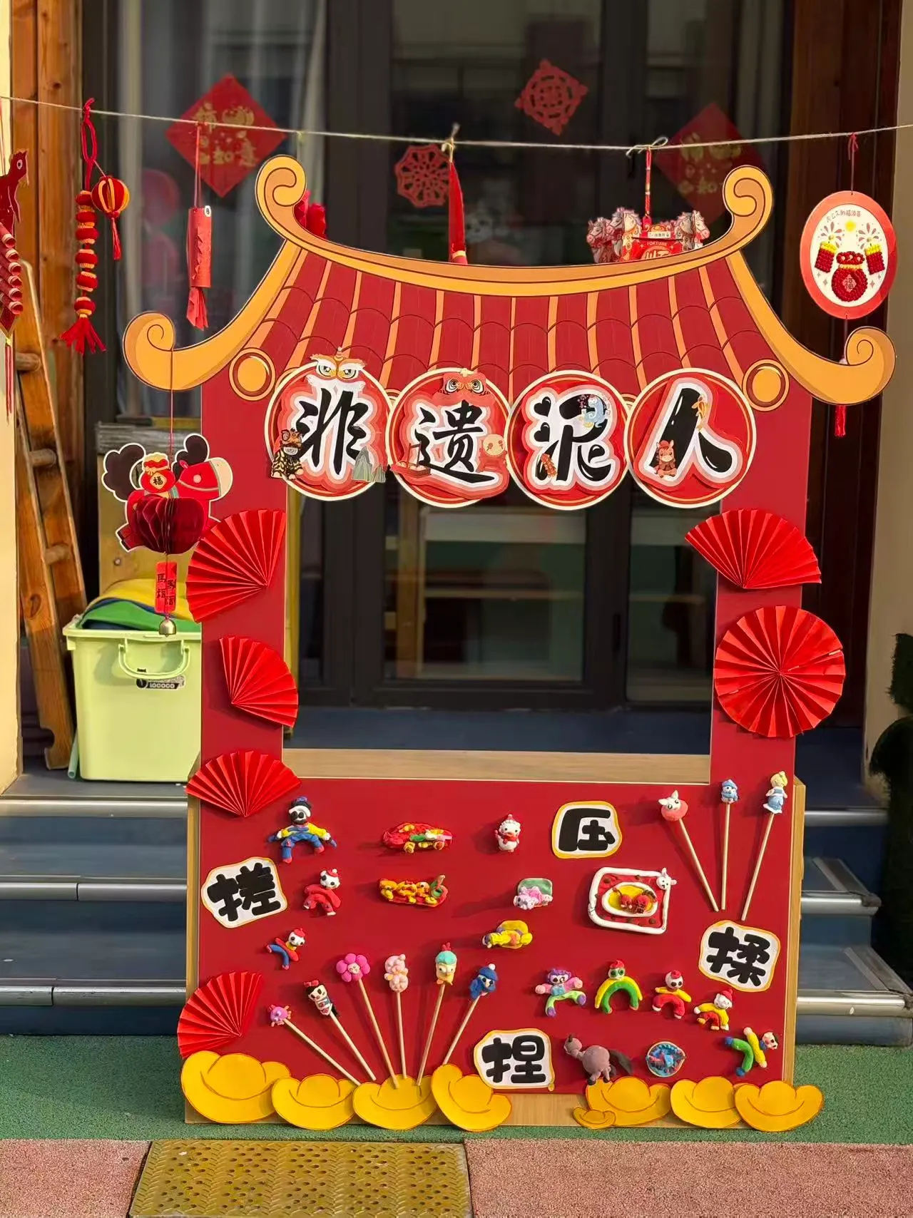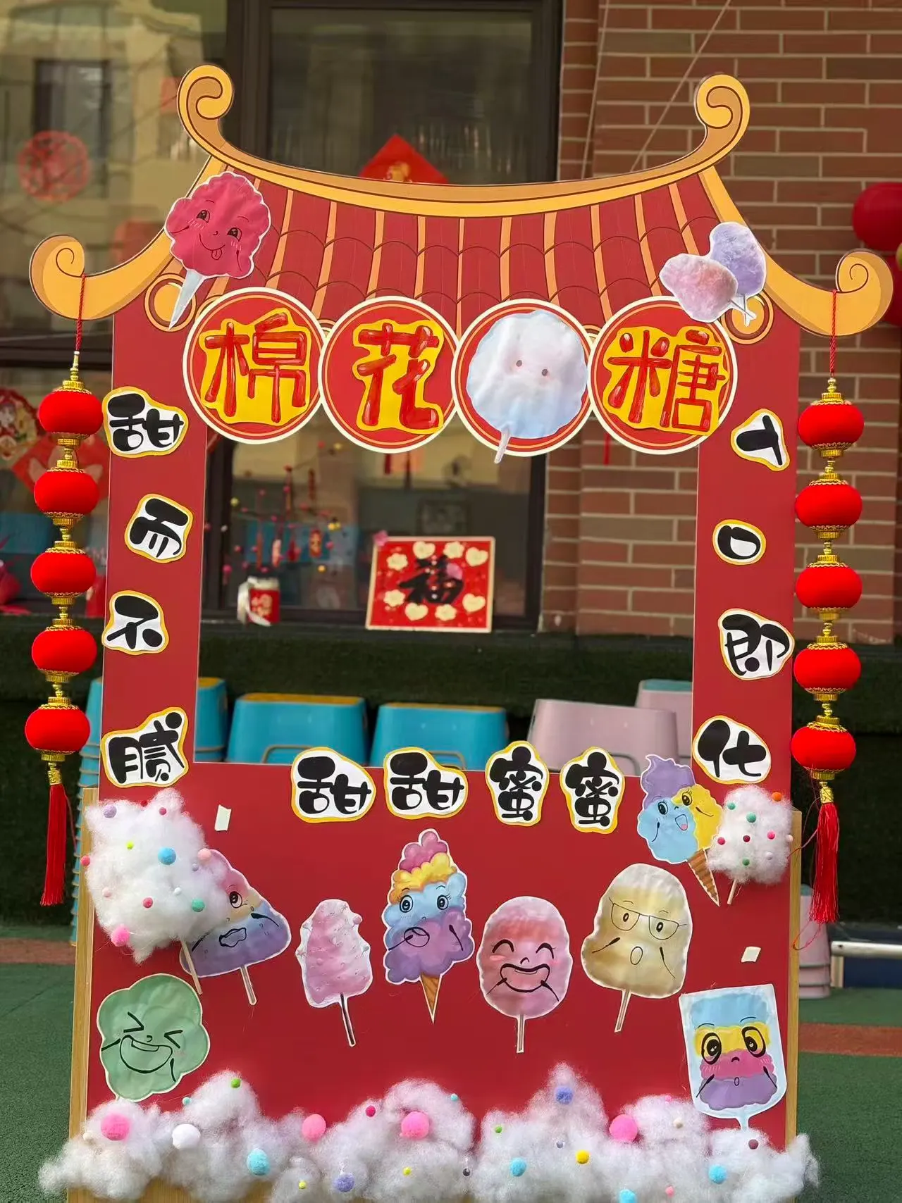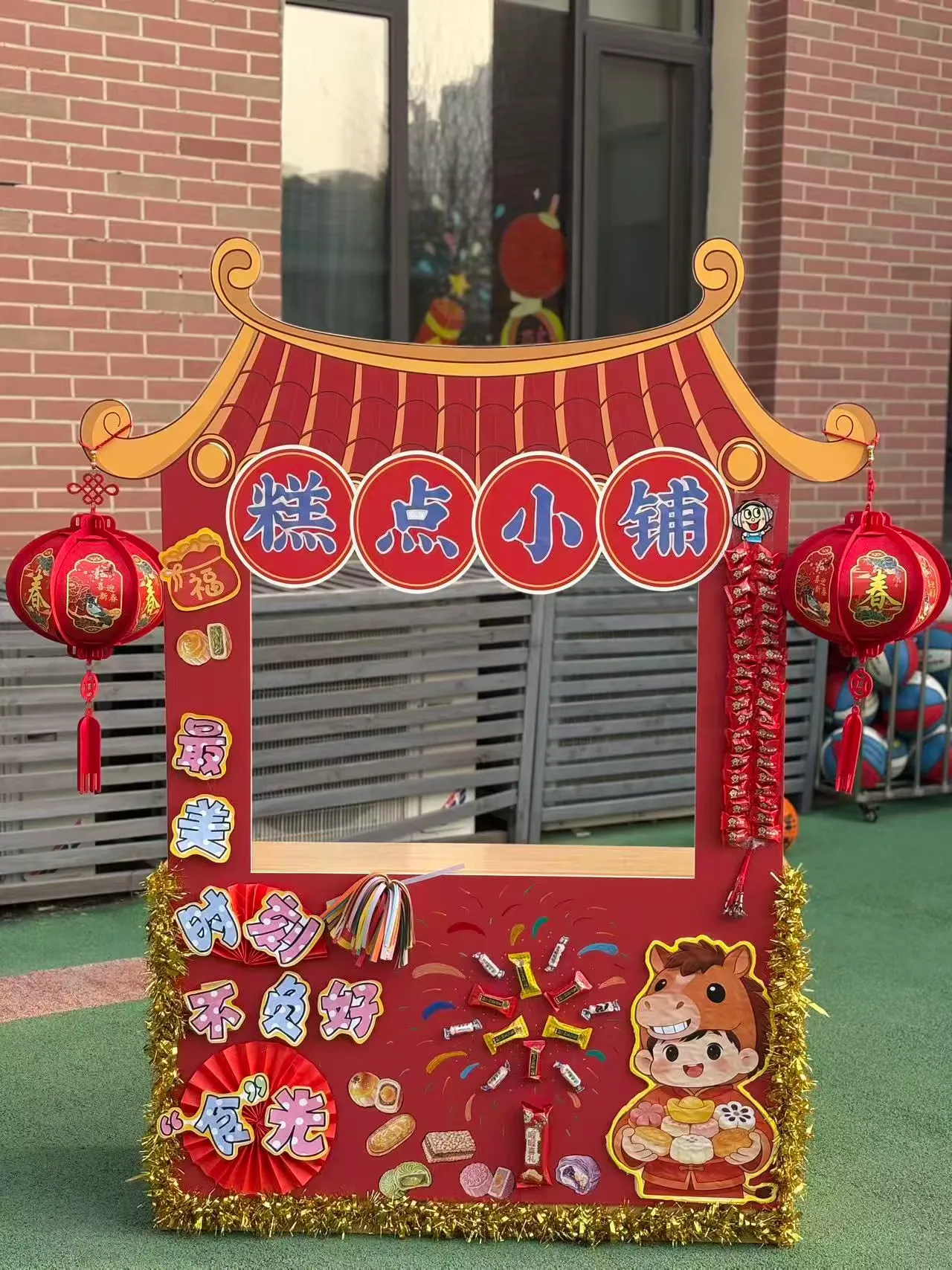 剪好的窗花、写满祝福的红色斗方,被孩子们亲手贴在教室、走廊的玻璃上。一时间,窗上红花映着笑脸,门上“福”字满载童真,灯笼高挂,彩带飘扬,孩子们用自己的双手,将整个园区装点得喜庆洋洋、年味十足。这份由童心参与营造的节日氛围,为即将开始的文化盛宴铺就了最温暖的底色。
