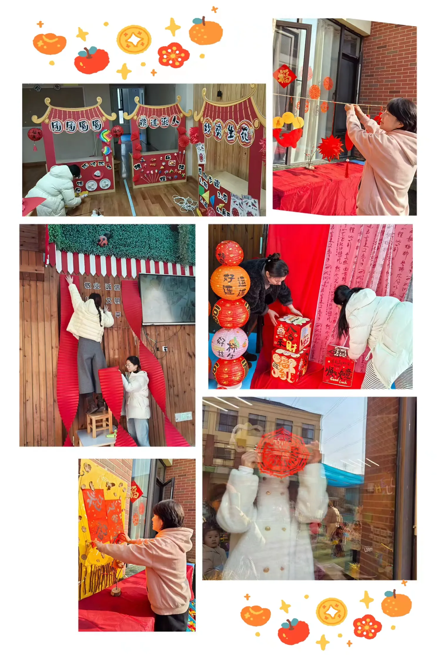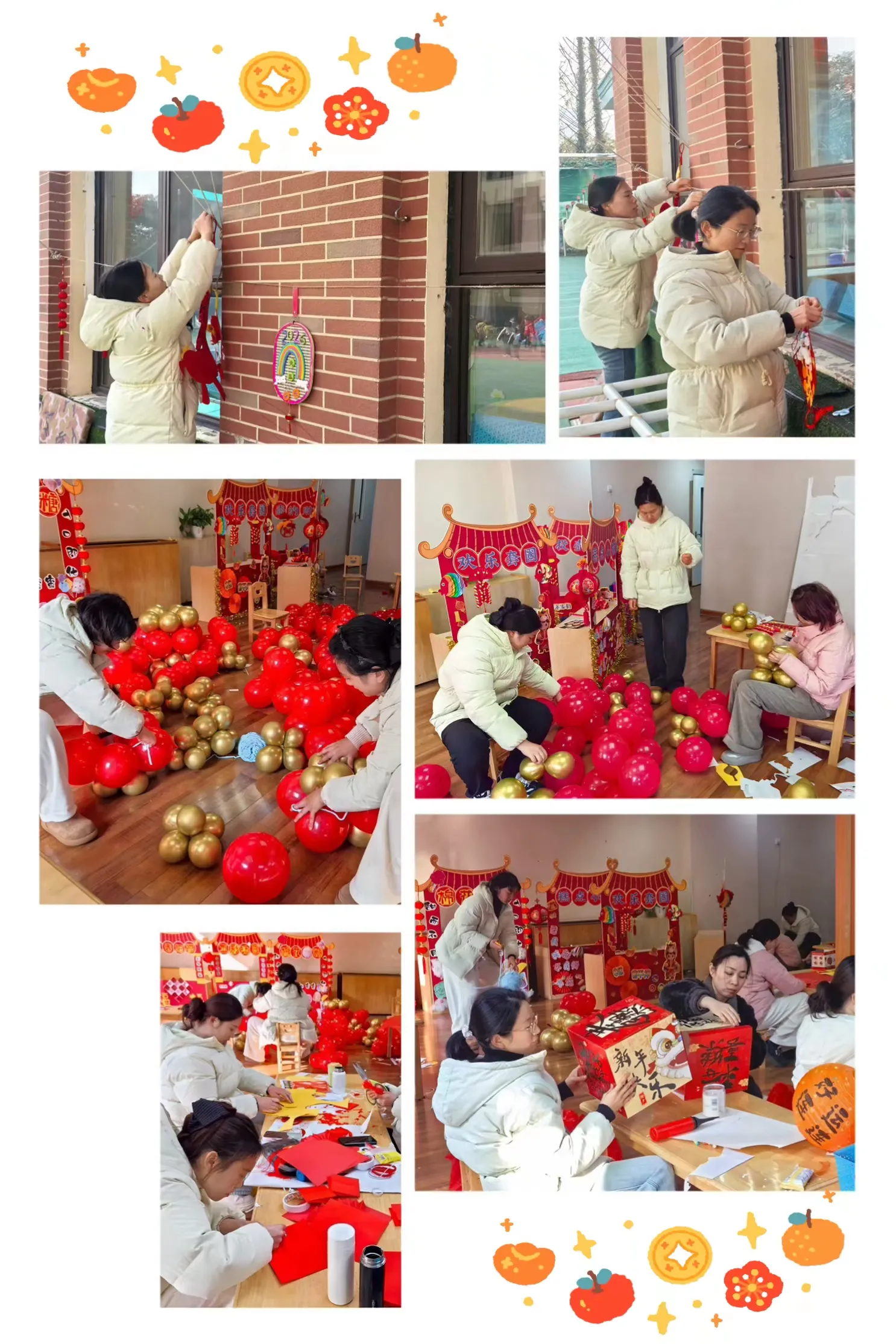 活动正式开始前,幼儿园已是一派火热的劳动景象。老师们精心分工,通力合作,共同将幼儿园装扮出浓浓的新年氛围。