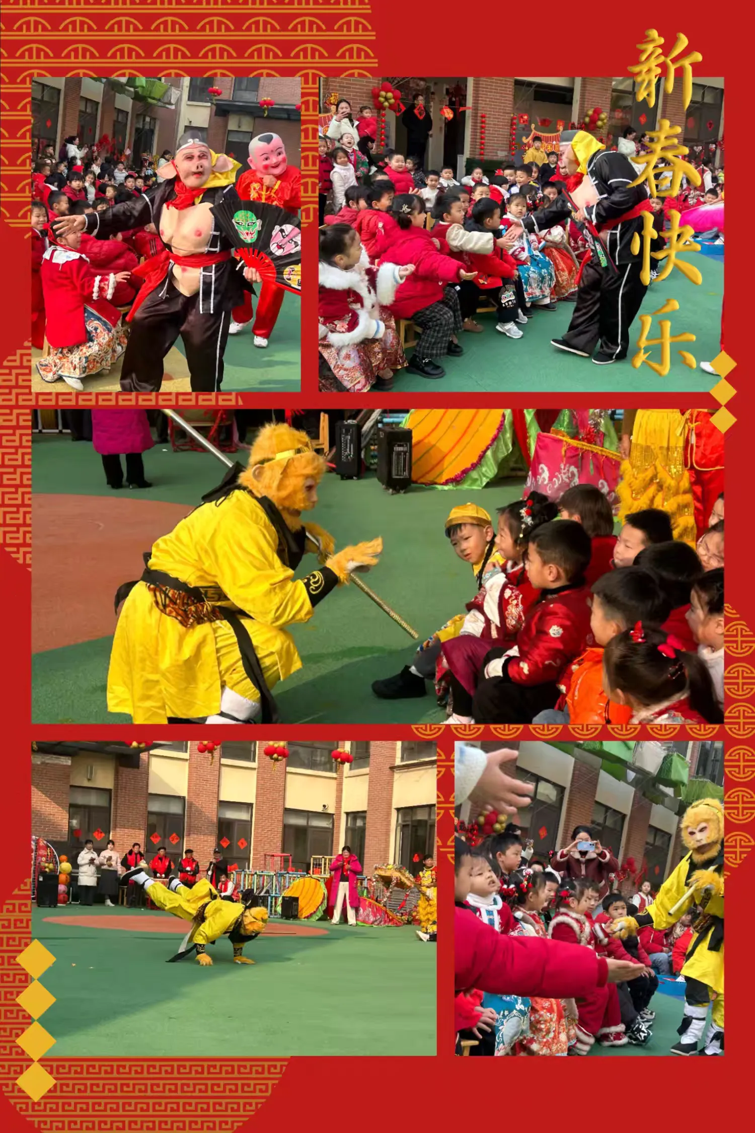 金箍棒一挥,欢笑声满园。快看,神通广大的悟空同学来啦!他踩着筋斗云的步伐,晃着金灿灿的金箍棒,在小朋友们身边蹦蹦跳跳,猪八戒也晃着沉甸甸的肚皮,凑到孩子们跟前和小朋友招手互动,让整个校园都充满了西游记的奇幻与欢乐。