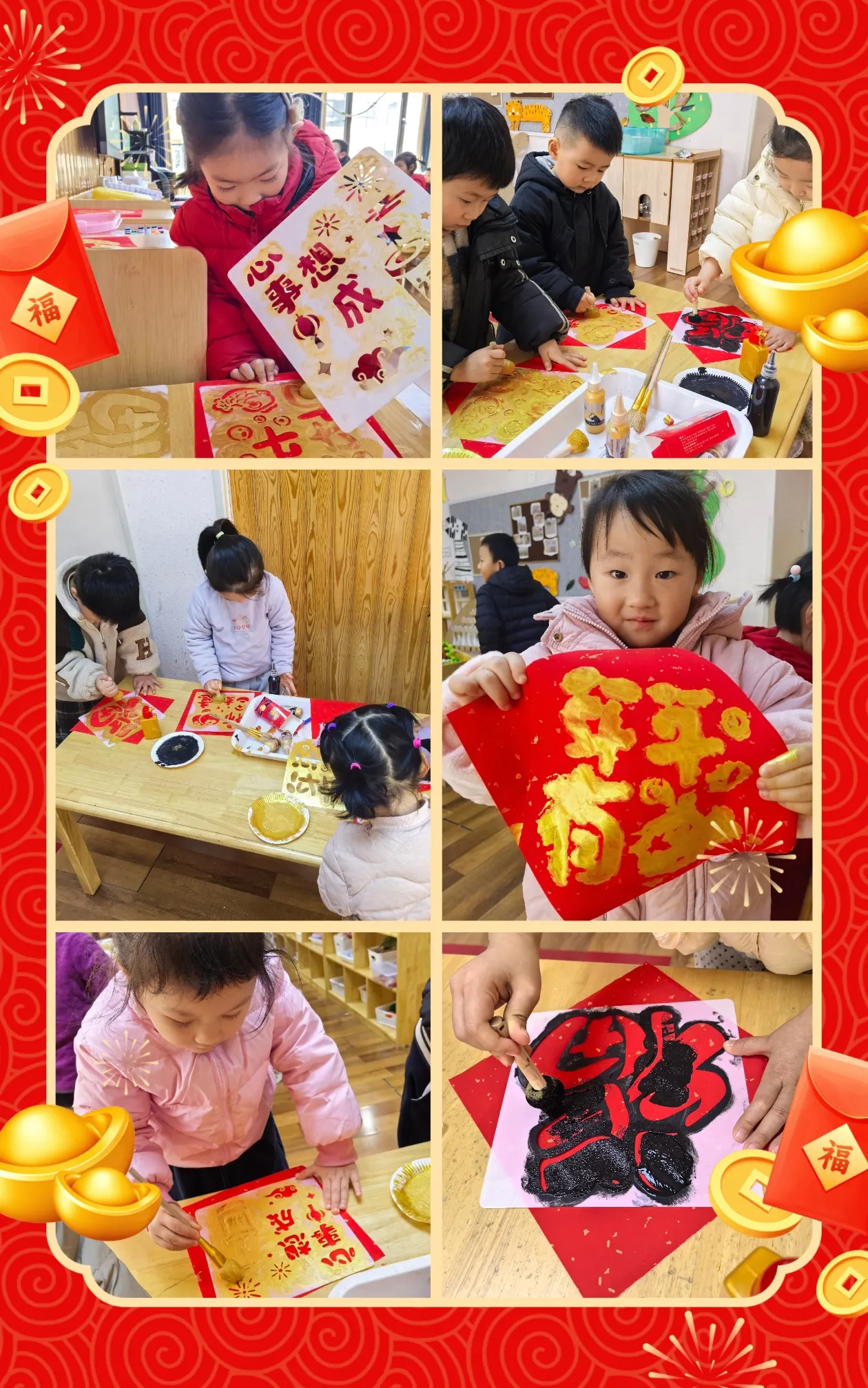 大班孩子们巧手剪窗花、提笔写“福”字;中班组老师带着孩子体验拓印的乐趣,一张张独具韵味的“福”字在稚嫩的小手下诞生;